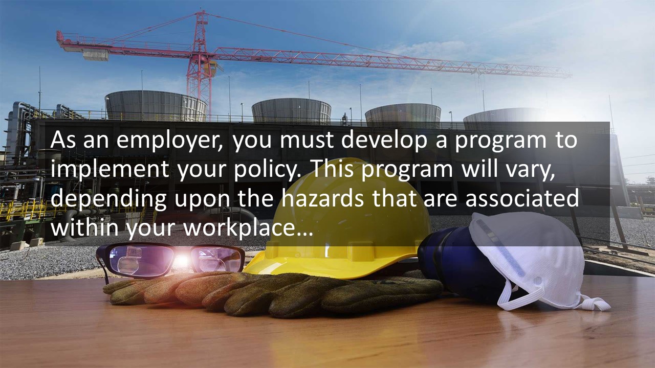 Under the Occupational Health and Safety Act, an employer must prepare and review at least annually a written occupational health and safety policy, and must develop and maintain a program to implement that policy.
