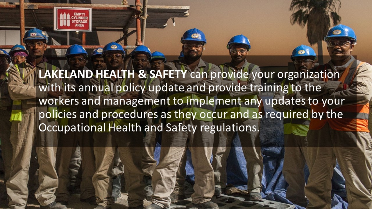 LAKELAND HEALTH & SAFETY can provide your organization with its annual policy update and provide training to the workers and management to implement any updates to your policies and procedures as they occur and as required by the Occupational Health and Safety Act.